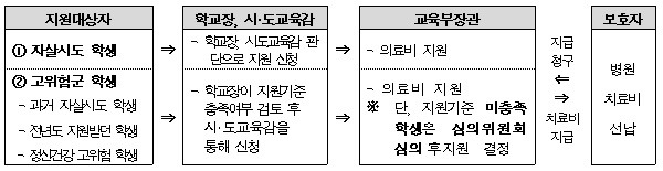 자살·자해 시도 등 정신건강 고위험군 학생에 대해서는 신체상해 및 정신과 병의원 치료비를 각각 최대 300만 원 한도 내에서 지급한다. 치료비 지원이 필요한 학생 또는 보호자가 소속 학교의 장에게 신청하면 지원 충족여부 검토 후 의료비를 지원한다.