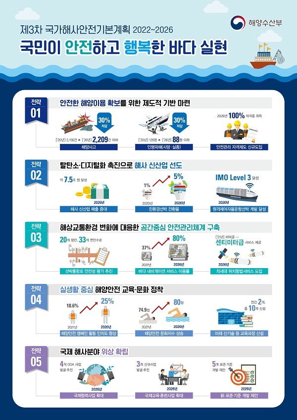 해양수산부는 18일 향후 5년간의 바다 안전에 관한 정책방향과 추진전략을 담은 ‘제3차 국가해사안전기본계획(’22~’26년)’을 발표했다고 밝혔다.