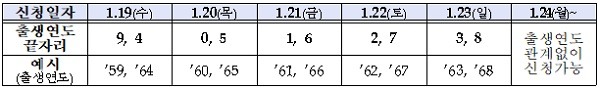 신청시간은 5부제 기간 중 매일 오전 9시부터 자정까지이며, 5부제가 적용되지 않는 24일부터는 오전 9시부터 24시간 접수한다.
