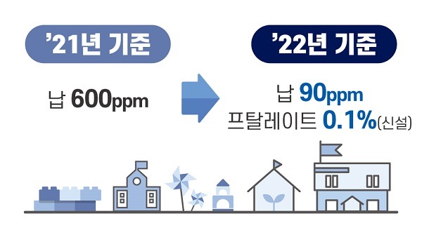 납 기준은 600ppm에서 90ppm으로, 프탈레이트류(DEHP, DBP, BBP, DINP, DIDP, DnOP, DIBP)는 총합 0.1% 이하로 강화된 관리기준을 신설한다. 다만, 시행 전에 설치된 어린이활동공간에 대해서는 2026년 1월 1일부터 강화된 규정을 적용할 예정이다.