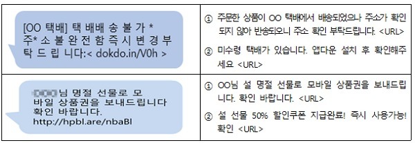 지난해 스미싱 신고(접수)·차단 20만 2000여 건 중 설 명절 등 택배를 많이 주고받는 시기를 악용한 택배사칭 스미싱이 17만 5000여 건으로 전체 대비 87%를 차지하는 것으로 분석돼 택배관련 스미싱에 대한 이용자들의 각별한 주의가 요구된다.