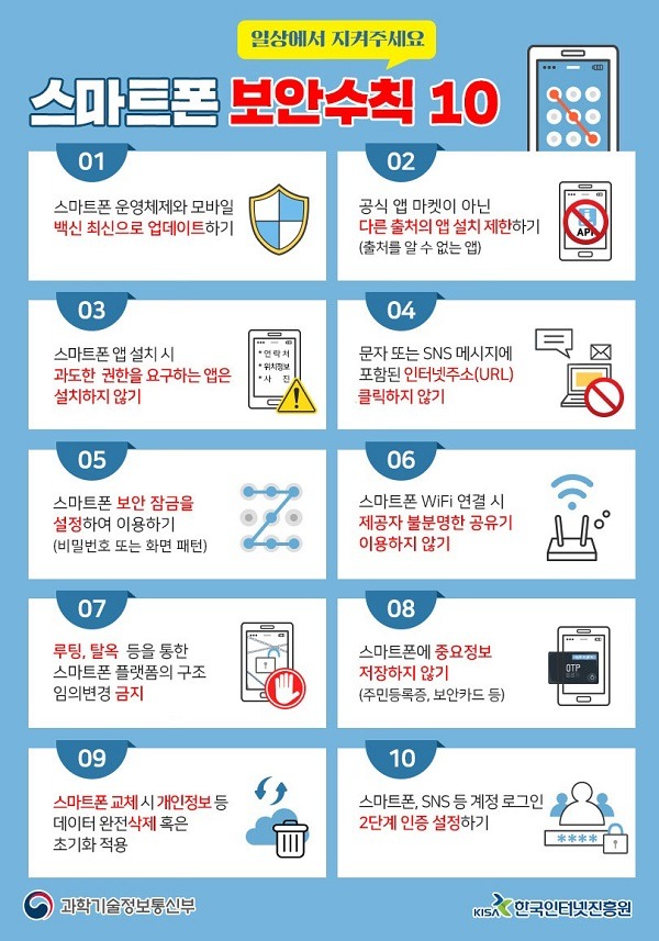 스마트폰 보안설정에 백신프로그램을 설치하고 업데이트 및 실시간 감시 상태 유지와 소액결제 차단 기능을 설정하고, 악성 앱 클릭 등으로 인한 감염이 의심된다면 전화 ‘118’로 신고 또는 ‘내PC 돌보미’ 서비스 신청을 통해 스마트폰 악성코드 유·무를 점검 받아야 한다.