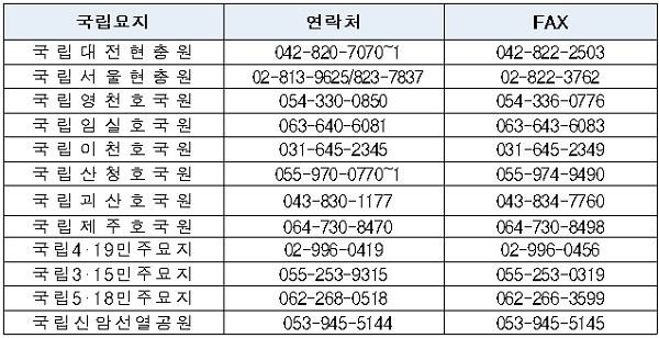 보다 자세한 사항은 각 국립묘지 누리집 또는 전화로 문의하면 자세한 내용을 확인할 수 있다.