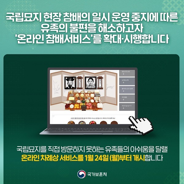 국가보훈처는 설 연휴 기간인 1월 29일부터 2월 2일까지 현충원, 호국원 등 전국 12개 국립묘지의 현장 참배 대신 ‘온라인 참배서비스’로 대체하고, 이를 확대 운영한다고 21일 밝혔다.