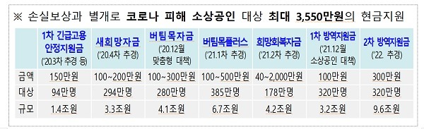 강화된 방역 조치로 매출이 감소한 소상공인에게 300만원씩을 지원하기 위한 예산 9조6000억원과 손실보상 추가 소요분 1조9000억원이 반영됐다. 우세종으로 전환한 오미크론 변이 확산에 대응해 병상 확보와 치료제 구매 등의 재원 1조5000억원도 포함됐다.