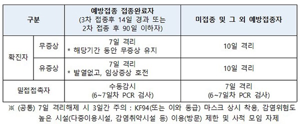 이에 확진자 격리기간은 예방접종완료자는 7일이며 미접종자 및 이외 접종자는 10일이다. 그리고 밀접접촉자 중 예방접종완료자는 수동감시를, 미접종자 등은 7일 자가격리하며 모두 6∼7일차에 PCR검사를 한다.