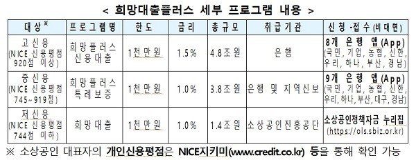 또한, 최근 강화된 거리두기 조치로 누적된 소상공인의 피해회복 지원을 위해, 10조원 규모로 초저금리 대출인 희망대출플러스 프로그램을 공급하며, 소상공인 방역지원금을 받은 업체를 대상으로 신용도에 따라 1~1.5% 초저금리로 최대 1000만원(대표자 기준)까지 지원한다.