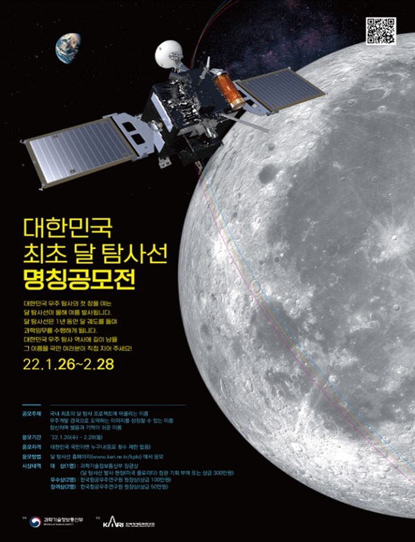 과학기술정보통신부는 1월 26일 오전 10시부터 2월 28일 오후 6시까지 한국항공우주연구원(이하 항우연)과 함께 대한민국 최초 우주탐사선인 달 탐사선(궤도선)의 이름을 정하기 위한 대국민 명칭공모전을 실시한다고 25일 밝혔다.