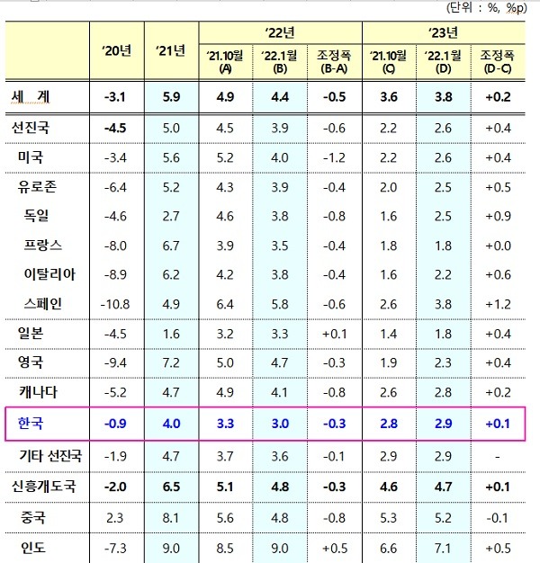이에 따르면 한국의 올해 경제성장률 전망치는 3.0%로 제시됐다. 이는 지난해 10월 전망치보다 0.3%p 하락한 수치다. 미국과 중국 등이 0.8~1.2%p 가량 하향한 것과 비교하면 비교적 적은 폭의 하락이다. 2023년 한국 경제성장률 전망치는 2.9%로 제시됐다.