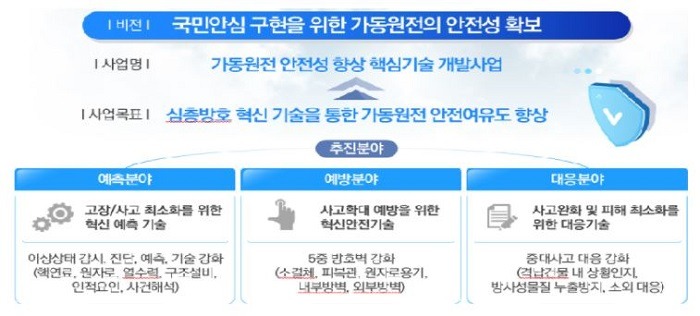 본 사업은 국민 안심 수준의 원전 안전성을 확보하기 위해, ❶정보통신기술 첨단기술 융합을 통해 원전의 이상 징후를 조기에 파악‧대처하고, ❷다수호기, 다중 사고, 극한 복합재해 등에 대한 사고 예방 기술을 강화하며, ❸소부장 기술 강화를 통해 사고 대응력을 높일 계획이다.