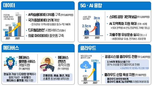 특히 2020년에서 2021년까지 추진한 주요 디지털뉴딜 사업에 중소기업을 중심으로 약 22만여 개의 기업·기관과 14만 명 이상의 인력이 참여하면서 어려웠던 우리 경제에 활력을 불어넣었다.