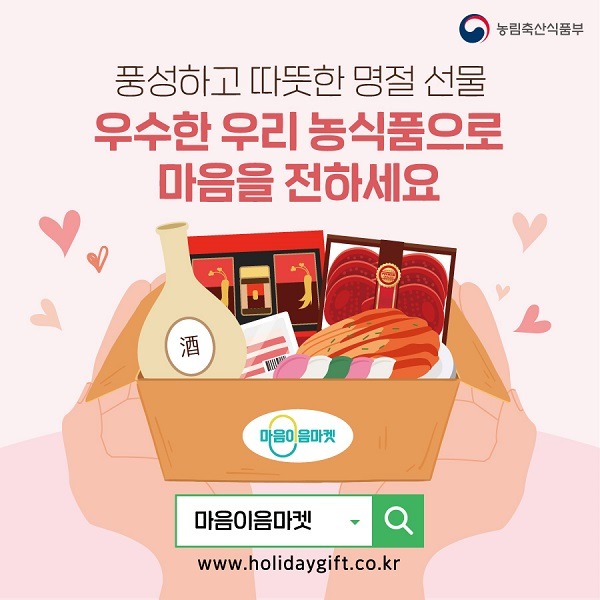 농림축산식품부는 명절 기간 우리 농축수산물 소비를 활성화할 수 있도록 농식품 전자카탈로그인 ‘마음이음마켓’(www.holidaygift.co.kr) 누리집을 개설해 운영하고 있다.