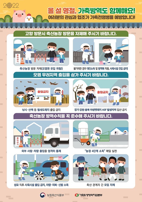 박정훈 농식품부 방역정책국장은 “설 연휴 기간에 소독 등 방역에 소홀할 경우 연휴 직후 가축전염병의 발생이 급증할 우려가 있다”며 “농장 종사자는 연휴 기간에도 매일 농장 내외부 청소·소독, 축사 출입 시 손 소독·장화 갈아신기 등 방역수칙을 반드시 준수해달라”고 당부했다.