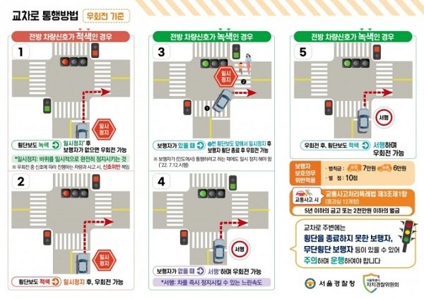 이번에 공포된 개정 도로교통법 시행규칙에 따르면 운전자는 차량 신호등이 적색일 때 우회전 하는 경우 정지선, 횡단보도 및 교차로 직전에서 정지한 후 우회전 해야 한다.