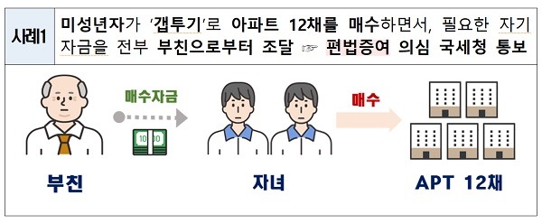 위법의심거래의 주요 사례를 보면 우선, 경제적 능력이 없는 미성년자가 임대보증금 승계 방식으로 저가아파트 12채를 매수하면서 임대보증금 외 필요한 자기자금은 부친이 매도인에게 송금하는 등 편법증여가 의심 사례로 적발됐다.