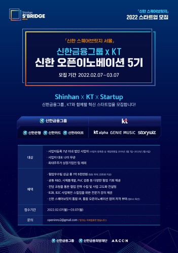 KT는 신한금융그룹과 손잡고 혁신 스타트업 발굴을 위해 '신한 오픈이노베이션 5기'에 공동 참여한다고 밝혔다.