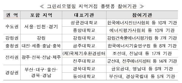 수도권·강원권·충청권·전라권·경상권 등 권역별 그린리모델링 지역거점 플랫폼이 선정돼 전국 80개 기관이 연합체(컨소시엄) 형태로 참여한다.