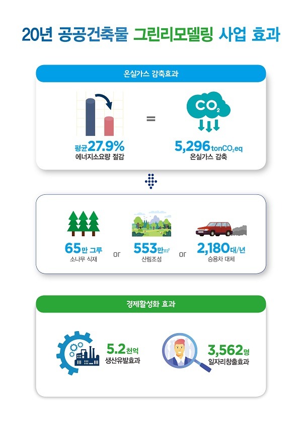 한편, 2020년 한 해 동안 지원했던 공공건축물 그린리모델링 지원사업을 통한 온실가스 감축효과 등을 산정해 본 결과 사업추진을 통해 모두 5300톤에 달하는 온실가스가 절감된 것으로 분석됐다. 이를 식재효과로 환산하면 소나무 65만 그루(강원지역 30년산 소나무기준)에 해당하는 것으로 파악됐다.