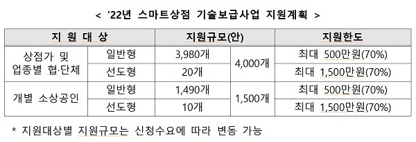 신재경 중기부 스마트소상공인육성과장은 “스마트기술 보급이 코로나로 인해 경영 애로를 겪고 있는 소상공인들에게 조금이라도 보탬이 되길 바라고, 최대한 신속하게 사업을 추진해 나가겠다”고 밝혔다.