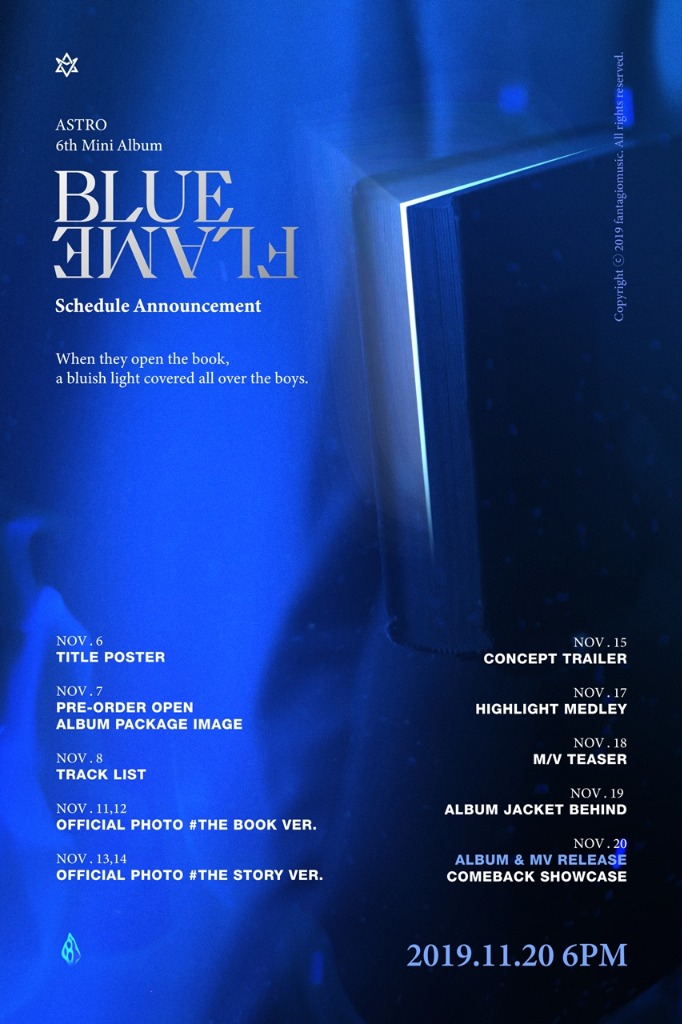 아스트로(MJ, 진진, 차은우, 문빈, 라키, 윤산하)의 소속사 판타지오뮤직은 5일 오후 6시 공식 SNS 채널을 통해 11월 20일 발매 예정인 미니 6집 앨범 ‘BLUE FLAME'(블루 플레임)의 프로모션 플랜 포스터를 공개했다.