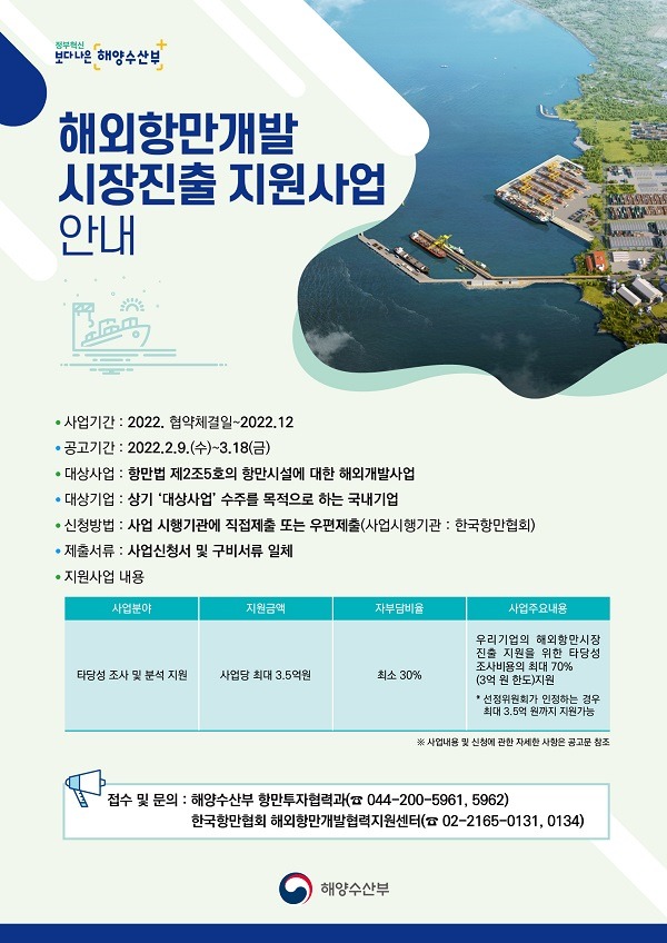 해양수산부는 9일부터 3월 18일까지 해외 항만개발 타당성 조사 비용의 최대 70%를 지원하는 ‘해외 항만개발시장 진출 지원사업’ 대상자를 모집한다고 8일 밝혔다.
