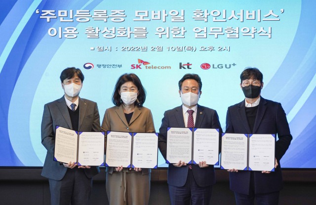 행정안전부는 2월 10일(목) 서울시 중구 SKT타워에서 SK텔레콤, 케이티, LG유플러스와 함께‘주민등록증 모바일 확인서비스’의 보안성 강화 및 이용 활성화를 위한 업무협약(MOU)을 체결한다고 밝혔다.