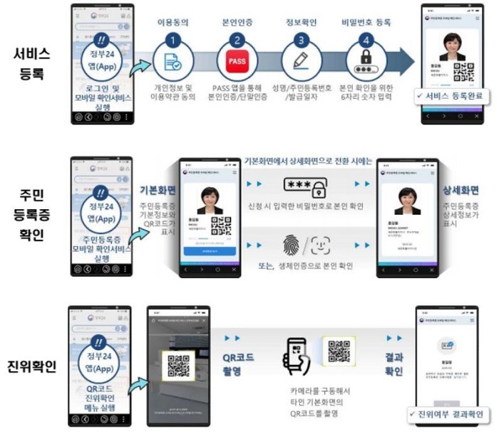 ‘정부24’를 통해 본인확인 절차를 거친 후, 신분확인번호(QR코드)와 주민등록증 수록사항을 화면에 표시하여 본인의 신분을 확인시켜 주거나 또는 QR코드 촬영을 통해 진위여부를 확인하는 방식으로 이용하게 된다.