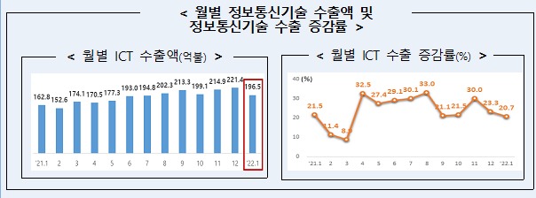 지난달 우리나라 정보통신기술(ICT) 수출액은 전년 동월대비 20.7% 증가한 196억 5000만달러로, 역대 1월 중 최대 규모 실적을 달성했다. 지난해 4월 이후 10개월 연속 두 자릿수의 견조한 성장세를 지속했고, 주력 시장과 주력 품목 대부분이 수출 호조세를 보였다.