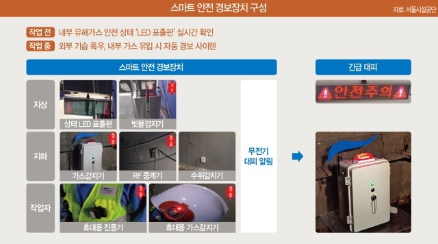 오랫동안 이 문제를 고민하던 서울시설공단은 노동자들이 지하 밀폐공간에서 안전하게 작업할 수 있도록 ‘스마트안전경보시스템’을 개발하고 작업의 안전성을 높이는 데 성공했다. 스마트안전경보시스템을 통해 밀폐공간의 작업환경이 얼마나 바뀌었는지 개발자와 현장의 공사감독에게 직접 들어봤다.