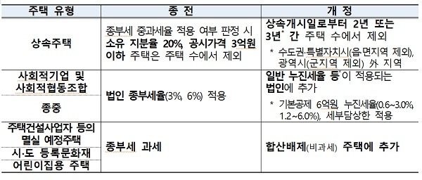 상속주택의 경우 상속개시일로부터 2년 또는 3년 동안 종합부동산세 과세 표준에는 합산하되 세율 적용 때 주택 수에서 제외하는 한편, 사회적기업 및 사회적협동조합, 종중에 대해서는 일반 누진세율이 적용되는 법인에 추가해 세부담을 완화한다.
