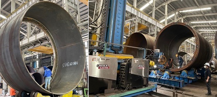 포스코의 후판작업을 사용해 풍력타워용 구조물을 제작하고 있는 모습으로, 좌측이미지로 풍력타워용의 큰 이미지가 확인가능하며, 우측은 작업하고 있는 직원들의 모습을 확인할 수 있다.