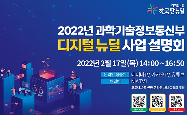 이와 관련해 과기정통부는 17일 ▲데이터 댐 ▲5G·AI 융합 ▲K-사이버방역 ▲초연결 신산업/SOC 디지털화 등 4개 분야로 구분한 ‘2022년도 디지털 뉴딜 사업 설명회’를 개최, 온라인 생중계를 진행한다.