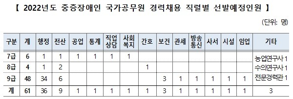 직업상담과 사회복지, 보건 등 13개 분야에서 올해 중증장애인 국가공무원 61명을 경력채용한다.