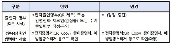 한편 개편된 방역체계에 따라 출입명부 운영을 조정한다. 그동안 접촉자 추적관리를 위한 정보수집과 방역패스 확인 목적으로 다양한 방식의 출입명부를 활용했으나 앞으로 출입명부 의무화는 잠정 중단한다.