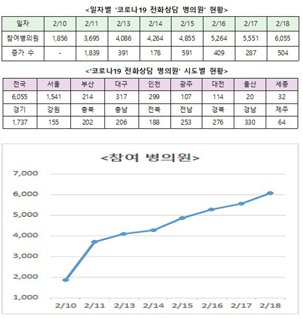 전국에서 전화 상담·처방이 가능한 ‘코로나19 전화상담 병·의원’은 지난 10일 1856곳에서 18일 기준 6055곳으로 일 평균 약 18.4% 씩 빠르게 증가하고 있다.