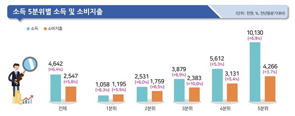 사업소득도 소비 증가(6.3%), 자영업자 증가(4만8000명) 등에 따라 8.6% 늘어 101만8000원이었다. 1분위(근로 17.1%, 사업 7.0%)의 주요 시장소득 상승률이 5분위(근로 7.3%, 사업 2.7%)를 넘어섰다.