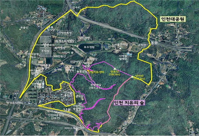 인천광역시는 인천대공원에 치유의 숲을 조성하고 일상에 지친 시민들의 심신을 달랠 산림치유 프로그램을 운영하고 있다.