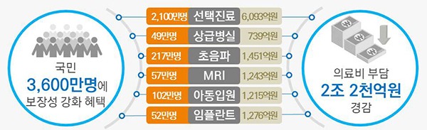 이는 국민 부담이 큰 3대 비급여 부담 해소를 위해 선택진료비 폐지와 상급종합병원·종합병원 2·3인실 건강보험 적용 및 간호·간병통합서비스 확대 등을 추진한 결과다.