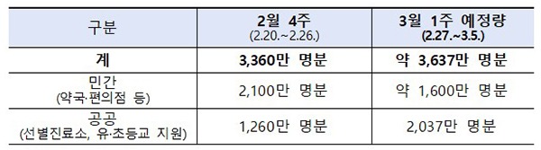 2월 한달간은 총 1억 520만 명분의 자가검사키트를 공급했는데, 이 중 선별진료소 등 공공분야에 3700만 명분, 약국·편의점 등 민간분야에 6820만 명분을 공급했다.