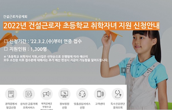 건설근로자공제회가 심각한 인구절벽 시대에 결혼·출산을 지원하고 자녀양육에 대한 사회적 책임을 함께하고자 2022년 초등학교 취학자녀 지원사업을 실시한다.