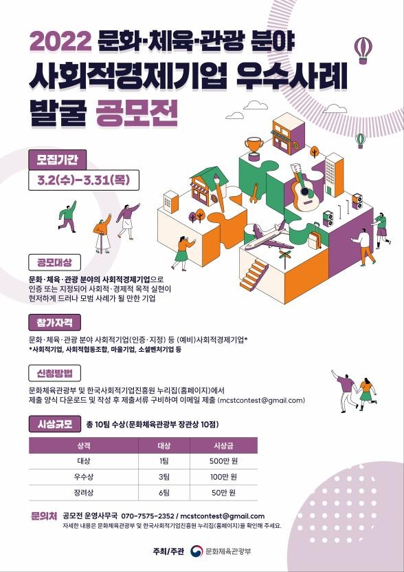 공모전 참가 자격과 신청 방법 등 더욱 자세한 내용은 문체부(www.mcst.go.kr)와 한국사회기업진흥원 누리집(www.socialenterprise.or.kr)에서 확인할 수 있다.