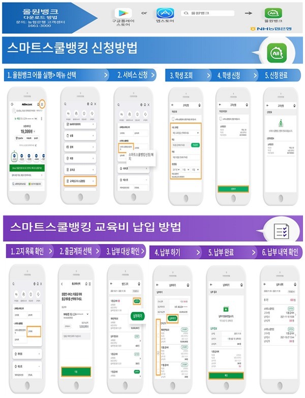 스마트스쿨뱅킹 서비스는 농협은행의 올원뱅크 앱을 통해 이용 가능하며, 교육비 납부에 대한 고지 기능이 추가돼 언제든지 고지 내용과 납부 내역을 확인할 수 있다.