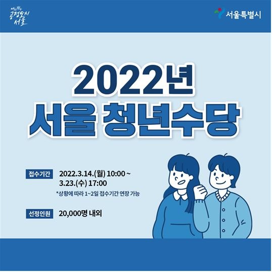 서울시는 올해 달라지는 ‘청년수당’ 4가지를 소개하고, 3월 14일(월) 오전 10시~3월 23일(수) 오후 5시 서울청년포털(https://youth.seoul.go.kr/youth/)을 통해 신청 접수를 받는다고 밝혔다.(온라인 신청만 가능) 첫 지급일은 4월 29일(금)이다.
