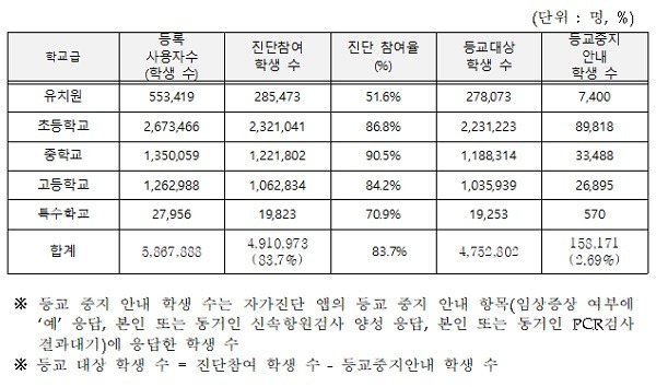 3월 2일 개학 첫날에는 약 491만 명의 학생들이 자가진단 앱을 활용했으며, 전체 83.7%의 참여율을 기록한 것으로 나타났다. 자가진단 앱을 통해 등교 중지가 안내된 학생은 15만 8171명으로 2.69%에 이른다.