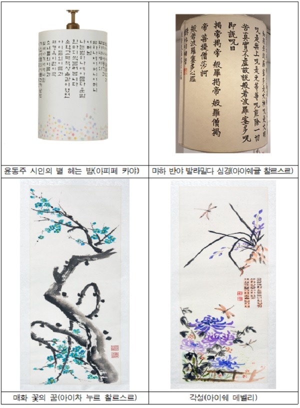 윤동주 시인의 ‘별 헤는 밤’, ‘하늘과 바람과 별과 시’를 한지로 만든 전등부터 반야경전의 중심 시상을 270자로 함축시켜 서술한 ‘마하반야바라밀다심경’을 한자로 쓴 작품과 탈출, 연꽃, 크즈쿨레시, 한옥 등을 표현한 다양한 작품이 전시됐다.