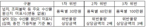 앞으로 수산물 원산지를 표시하지 않을 경우 위반 횟수에 따라 과태료가 가중 부과된다.