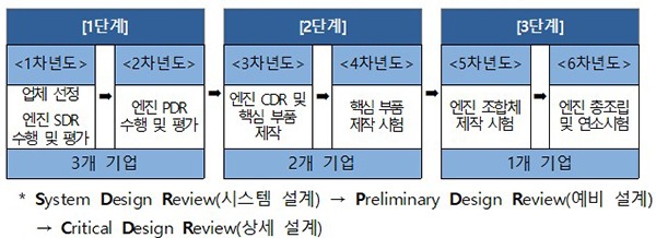 3개 기업(연합체)을 선정해 소형발사체의 상단(2단) 엔진을 설계·제작하고 두 차례의 단계평가를 통해 최종 1개 업체를 선정해 설계·제작한 엔진의 성능시험을 진행한다.