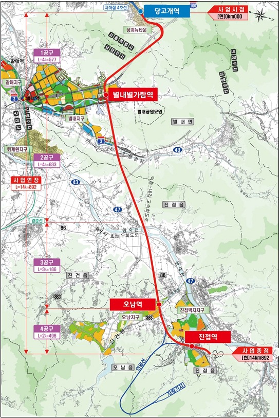 진접선은 대부분 터널구간(12.8km, 86%)으로 건설돼 도시 간 연결성을 높였고 남양주 주거지구 이동수요를 고려, 별내별가람·오남역·진접역 등 3개 역사를 신설했다.