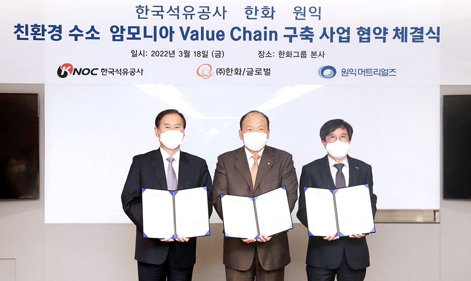 ㈜한화는 지난 18일 장교동 한화빌딩에서 한국석유공사, ㈜원익머트리얼즈와 '친환경 수소·암모니아 Value Chain 구축'을 위한 업무협약(MOU)을 체결했다고 밝혔다.