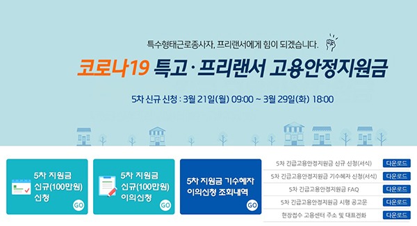 이번 신청은 1~4차 긴급고용안정지원금을 지원받지 않은 특수형태근로종사자(이하 ‘특고’)와 프리랜서 가운데 지난해 10~11월 중 이번 5차 긴급고용안정지원금에서 지원하지 않은 직종에 종사하지 않은 고용보험(근로자) 미가입자를 대상으로 한다.